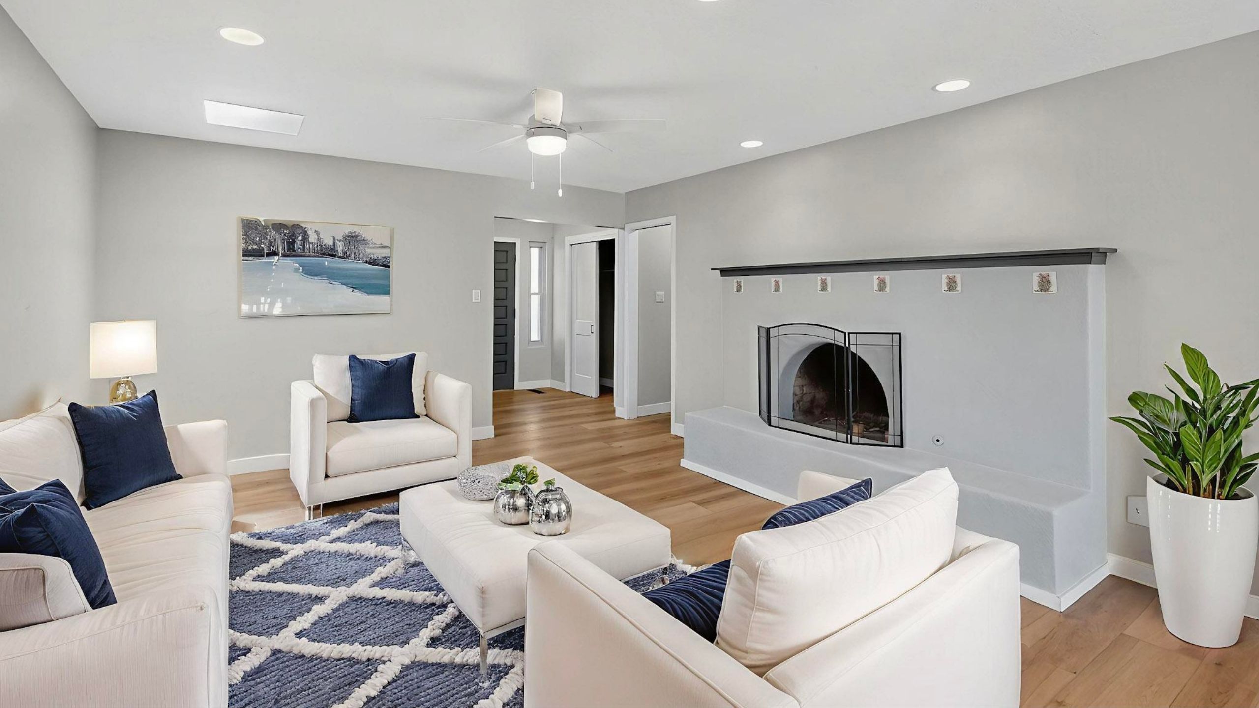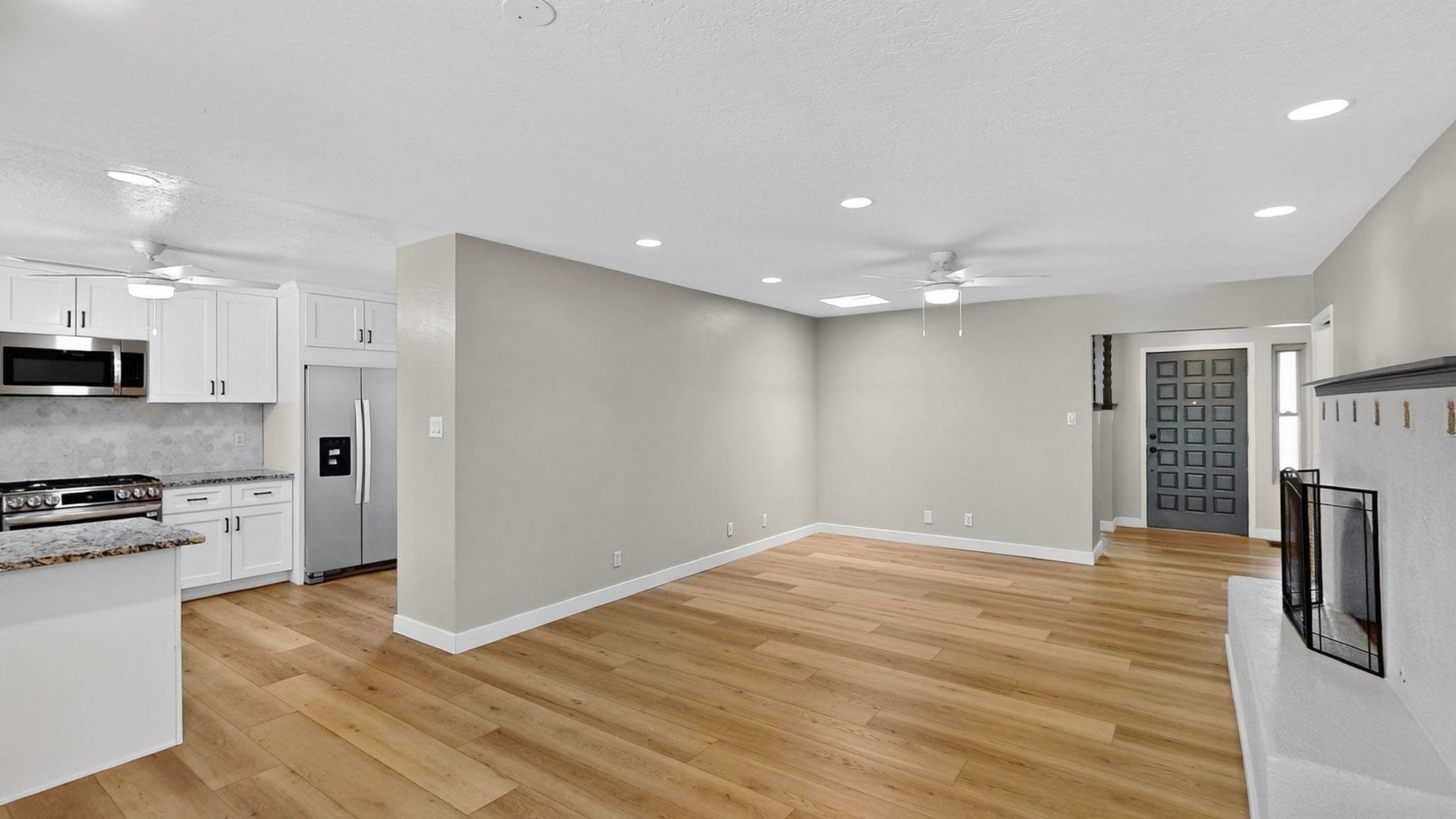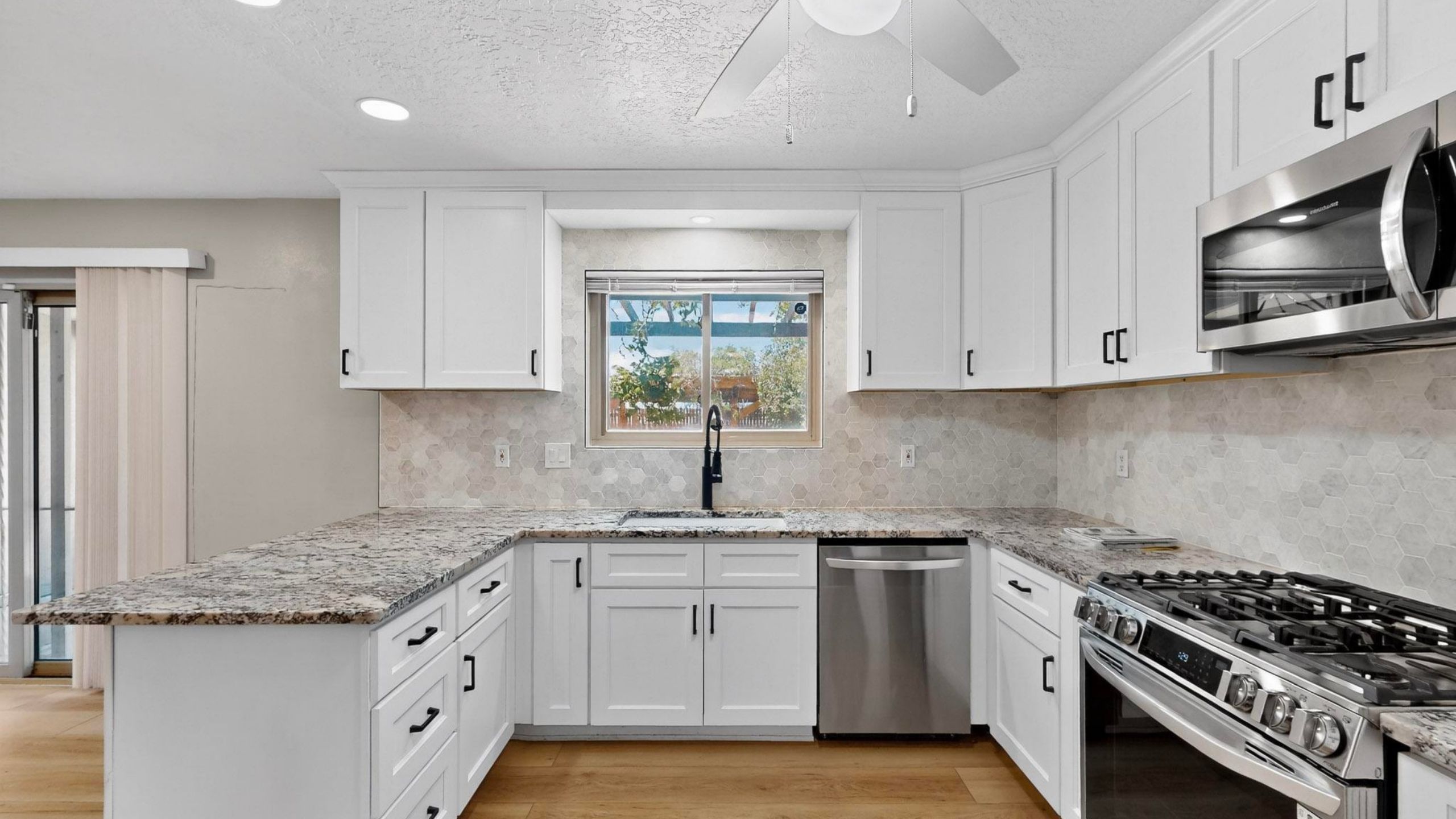 The updated kitchen features granite countertops and sleek stainless steel appliances, including a 5-burner gas range. Skylights and ceiling fans throughout keep things light and airy, while the wood-burning fireplace with a gas starter adds a cozy touch for cooler nights. Luxury vinyl plank flooring offers durability and style, and the owner’s suite includes a double vanity for added ease.